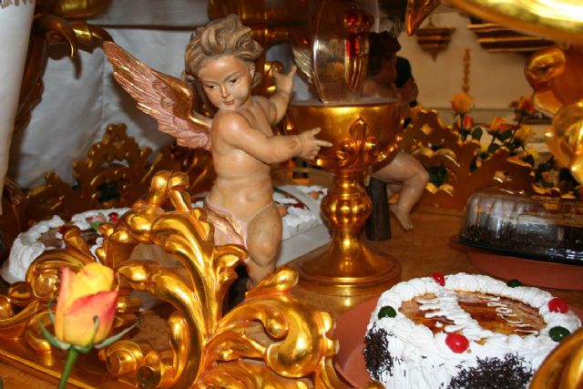 El trono va adornado de modo original, no solo lleva rosas, claveles o gladiolos sino también a sus pies dos tórtolas o palomas blancas como dice el Evangelio de San Lucas y lo más original, adornan el trono con ocho blancas tortadas -tartas-, por cada uno de los ocho Mayordomos de la Cofradía del Santísimo -popularmente la Hermandad del Señor-, que al realizarse una especie de "Bautizo del Niño" desde tiempo inmemorial las tortadas siempre han ido acompañando el trono como si de una celebración se tratara, en la presentación del Niño en el templo y la Purificación de la Madre. Por cierto, este día el postre de casi todo el pueblo son las tortadas y se calculan en más de un centenar las que este domingo degustarán en sus respectivas viviendas todos los pueblanos, invitando a este suculento manjar a las personas que acuden a la celebración procedentes de otras localidades, otros no se hacen de rogar y meten algún dedo a las que van el trono y empezar así a saborearlas.