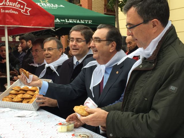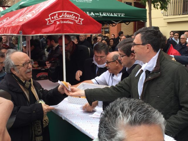 Al finalizar el acto, los asistentes se han dirigido a la Plaza de Romea, acompañados por un grupo de hachoneros, para participar en una degustación de pasteles de carne, cerveza y melón, junto con centenares de murcianos que se han acercado.