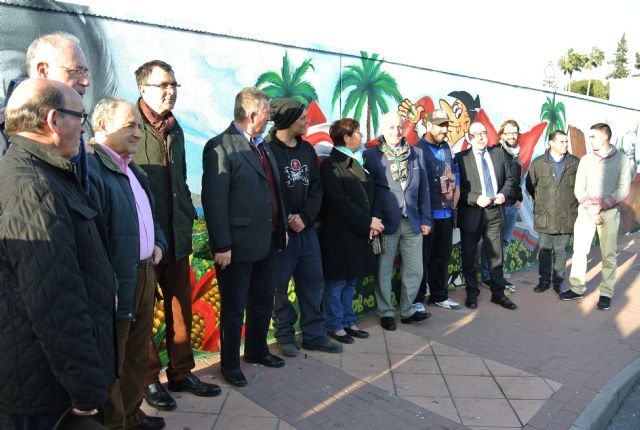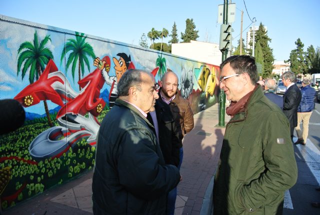 El Alcalde, José Ballesta, y el concejal de Fomento, Roque Ortiz, han visitado esta tarde el nuevo mural decorado con motivos relacionados con la Huerta en una pared exterior del hotel Nelva. En el acto, ha estado acompañado por la familia de José Travel ‘El Repuntín' y Manuel Sánchez Baena (MAN), creador del Tío Pencho, ya que como elementos destacados en el mural aparecen un retrato del trovero de Puente Tocinos y del protagonista de la tira cómica diaria del periódico La Verdad.