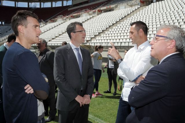 “El equipo está en primera línea de la batalla por el ascenso, por lo que los aficionados debemos unirnos en bloque para sacar adelante este proyecto que es de todos los murcianos”, recalcó el alcalde durante el acto, que contó también con la presencia del concejal de Deportes y Salud, Felipe Coello, el entrenador del Real Murcia, José Manuel Aira, y miembros del equipo.