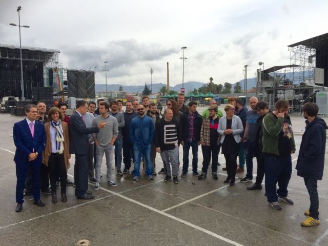 El alcalde de Murcia, José Ballesta, la consejera de Cultura y portavoz del Gobierno regional, Noelia Arroyo, y la dirección del Estrella de Levante SOS 4.8 visitaron esta mañana el recinto en el que se celebrará el festival y mantuvieron un encuentro con algunos de los artistas de la Región que participarán en esta novena edición.