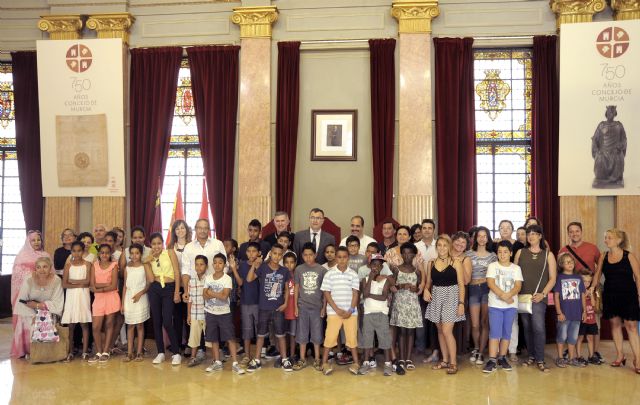 El alcalde de Murcia, José Ballesta, y la concejal de Juventud y Cooperación al Desarrollo, Rebeca Pérez, recibieron hoy en el Salón de Plenos a los  niños procedentes de los campamentos de refugiados saharauis de Tindouf (Sur de Argelia), que están pasando el verano con familias murcianas de acogida, a través de la asociación Sonrisa Saharaui Región de Murcia.