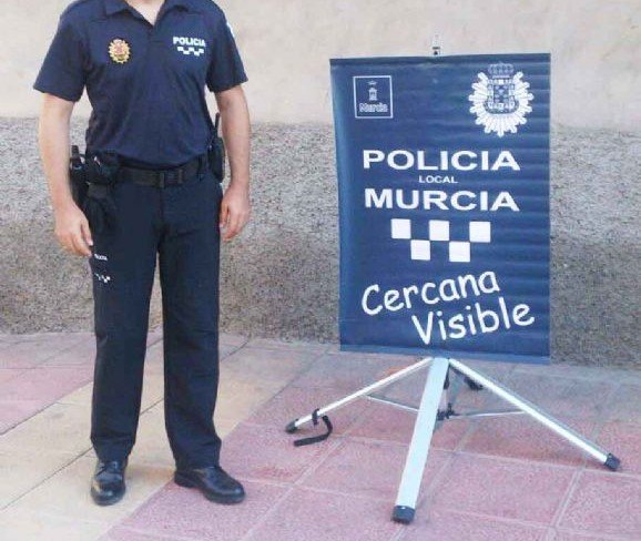 Es increíble que la campaña consista en instalar durante unos 30 minutos y varias veces al día un cartel portátil de 1 metro de altura en el que se puede leer “POLICIA LOCAL MURCIA, CERCANA VISIBLE” y que los policías tengan que permanecer a su lado sin patrullar y sin intervenir en ningún otro servicio.