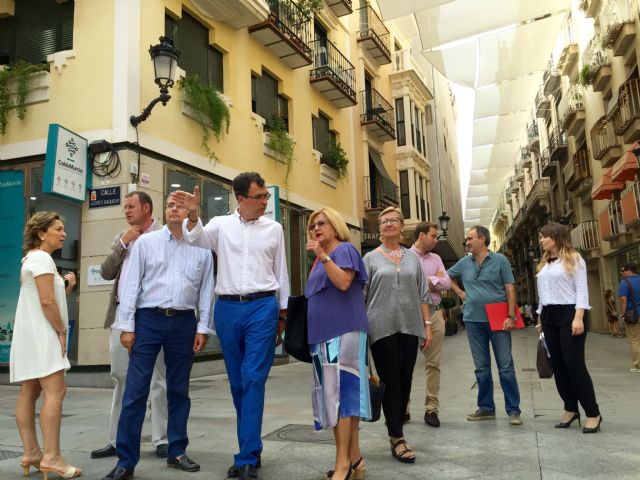 El alcalde de Murcia, José Ballesta, realizó hoy un recorrido por la zona comercial del centro de la ciudad, acompañado por la presidenta de la Asociación de Comerciantes de Platería y Trapería, Marisa Cano; una visita en la que el regidor dio a conocer que se está trabajando en diferentes proyectos para apoyar y fomentar el pequeño y mediano comercio, “que aglutina a más de 2.400 empresas y ya representa más del 12% del empleo total del municipio”.