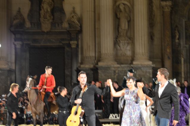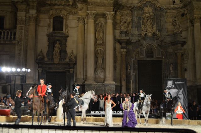 Más de tres mil personas han asistido en la noche de este jueves al espectáculo "Murcia Cabalga", exhibición ecuestre realizado por Club Aros, dentro del programa de la Feria de Murcia, celebrado en plaza Cardenal Belluga, frente a la Catedral.