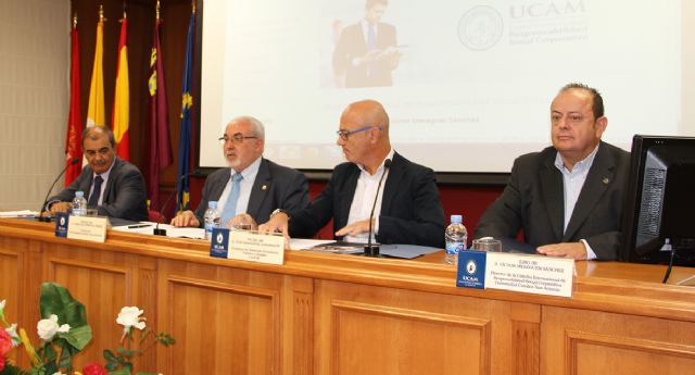 "Hoy es un día importante para esta universidad porque hemos creado un foro plural, abierto a todas las sensibilidades políticas, económicas y sociales de la Región de Murcia". Con estas palabras comenzaba su intervención Víctor Meseguer, director de la Cátedra RSC-UCAM, en referencia a la presentación del Foro Abierto de Responsabilidad Social Corporativa de la Universidad Católica de Murcia. Ante un salón de actos repleto de representantes de fundaciones y ONGs, de la administración pública política empresarial, y miembros de la Católica, Meseguer ha definido esta nueva apuesta de la UCAM como un espacio donde intercambiar experiencias, buenas prácticas y trabajos en la línea de apostar por una Región que sea respetuosa con los derechos individuales y colectivos de las personas, en acción social. "Hemos convertido hoy a la UCAM en la capital de la Responsabilidad Social Corporativa", ha señalado, y "vamos a apostar por una Región que sea un territorio socialmente responsable".