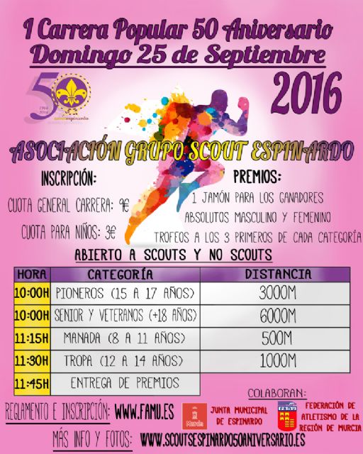 a Asociación Grupo Scout Espinardo, en colaboración con la Junta Municipal de Espinardo y la Federación de Atletismo de la Región de Murcia, organiza la I Carrera Popular “50 Aniversario Grupo Scout Espinardo”, el domingo 25 a partir de las 10:00h.
