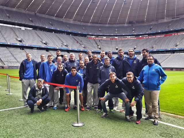 La plantilla del UCAM Murcia CB al completo ha visitado en la mañana del martes el Allianz Arena, el campo en el que juega la sección de fútbol del FC Bayern Munich. La expedición ha podido conocer de primera mano uno de los estadios cinco estrellas europeos y disfrutar de su modernidad y tecnología.