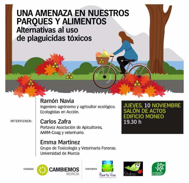 "Una amenaza en nuestros parques y alimentos" fue el título del acto en el que también participaron Huerta Viva, El Verdecillo y Ecologistas en Acción, y en el que intervinieron Ramón Navia, ingeniero agrónomo, agricultor ecológico y miembro de Ecologistas en Acción; Carlos Zafra, portavoz de la Asociación de Apicultores AA-RM Coag y veterinario, y Emma Martínez, del grupo de Toxicología y Veterinaria Forense de la Universidad de Murcia.