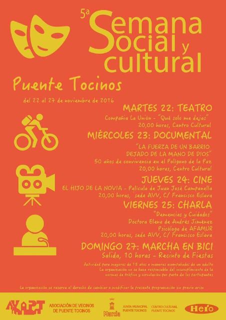 Del 22 al 27 de noviembre, se celebra en la pedanía de Puente Tocinos la quinta edición de la Semana Social y Cultural que organiza la Asociación de Vecinos y que cuenta con una amplia programación como teatro, audiovisual, cine, charla y marcha en bici.
