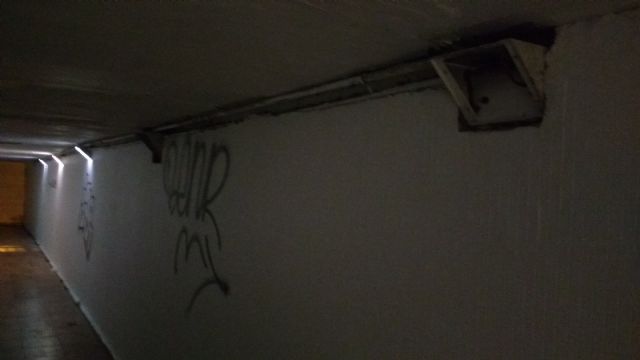Pues bien, el lunes día 19 ya tenían grafitis y han arrancado la puerta de la caja de registro para el alumbrado de dicho túnel, ademas de destrozar dos focos para alumbrado en el interior de dicho túnel.