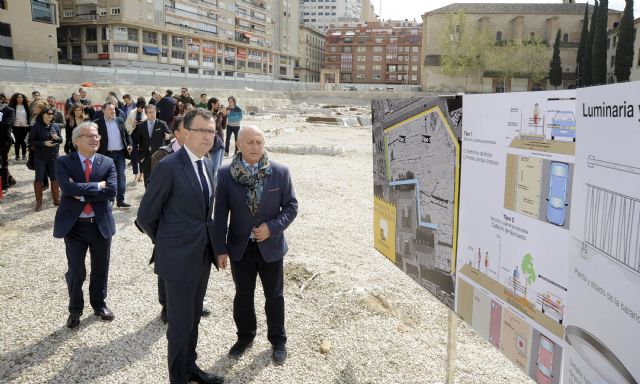 El alcalde de Murcia, José Ballesta, la consejera de Cultura y Portavocía, Noelia Arroyo, miembros de la Corporación municipal, representantes de Colegios Profesionales, la Universidad de Murcia, hosteleros y vecinos del barrio asistieron hoy al inicio de las obras del yacimiento de San Esteban y su entorno, una actuación que se pone en marcha para devolver a los murcianos este céntrico espacio público de 23.000 metros cuadrados, habilitando así un recurso cultural y turístico de nivel internacional para la ciudad y la Región de Murcia.