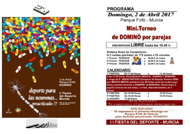 El alcalde pedáneo de San Ginés, Jesús Pintado, realizará el domingo en el Parque Fofó una exhibición de dominó con motivo de la celebración de una jornada que, organizada por la Federación Murciana de Dominó, dará comienzo a las 11 horas y que tiene como fin fomentar este deporte de mesa como opción para estimular la memoria.