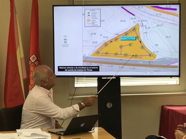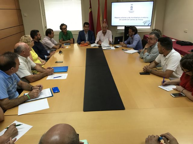 La construcción del nuevo puente del Camino de Tiñosa va a estar acompañada por una decena de medidas que harán posible mejorar la calidad urbana de la que disfrutan los vecinos y garantizar la permeabilidad del entorno. Así lo han explicado esta mañana el concejal de Fomento, Roque Ortiz, y el Director General de Transportes, Costas y Puertos, José Ramón Díez de Revenga, en la reunión que han mantenido con los miembros de las juntas municipales de Los Garres y Los Dolores, así como con los representantes de la Asociación de Vecinos de Camino Tiñosa. A la sesión han asistido también técnicos responsables de las obras.
