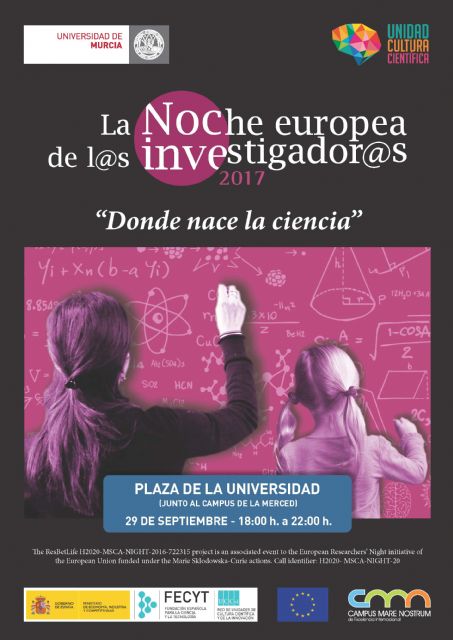 Este evento europeo, organizado por la Unidad de Cultura Científica del Vicerrectorado de Comunicación y Cultura de la UMU, cuenta con la financiación de la Fundación Española para la Ciencia y la Tecnología (FECYT), del Ministerio de Economía, Industria y Competitividad, y es un evento promovido por la Unión Europea en el marco de las acciones Marie Sklodowska-Curie.