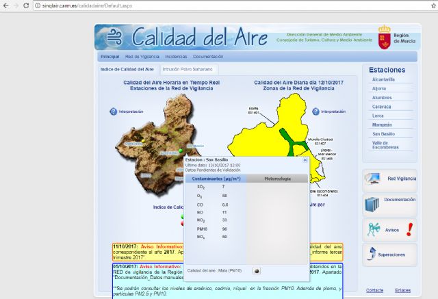 Los datos del portal sobre la calidad del aire de la Dirección General de Medio Ambiente Consejería de Turismo, Cultura y Medio Ambiente, corrobora la denuncia de Ahora Murcia, al destacar que la estación medidora sita en el barrio de San Basilio da alarma por la mala calidad del aire en la ciudad de Murcia.