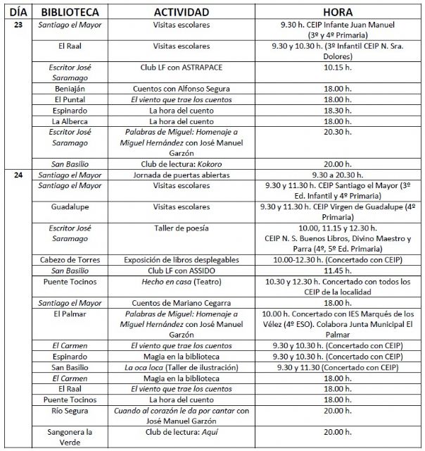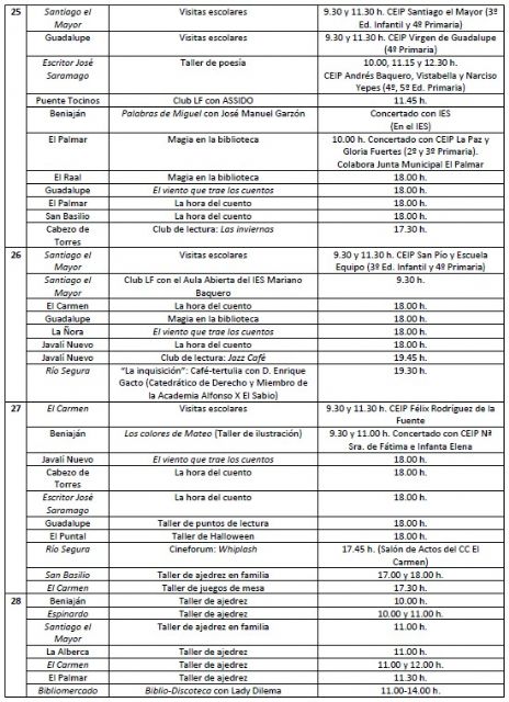 Es por ello que la concejalía de Educación que dirige Rafael Gómez, a través de la Red Municipal de Bibliotecas de Murcia, ha programado un conjunto de actividades que se van a desarrollar hasta el próximo 28 de octubre y cuyos protagonistas serán estudiantes de primaria y secundaria de numerosos centros educativos del municipio.