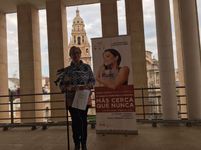 La concejala de Comercio del Ayuntamiento de Murcia, Maruja Pelegrín, ha presentado esta mañana acompañada de la Federación de Asociaciones de Comerciantes de Murcia, Asociación de Comerciantes del Barrio del Carmen y Asociación de Comerciantes Área Comercial Murcia Centro la Feria Outlet del Comercio Murcia 2017 que tendrá lugar en la ciudad de Murcia en las fechas del 2 al 5 de noviembre de 2017.