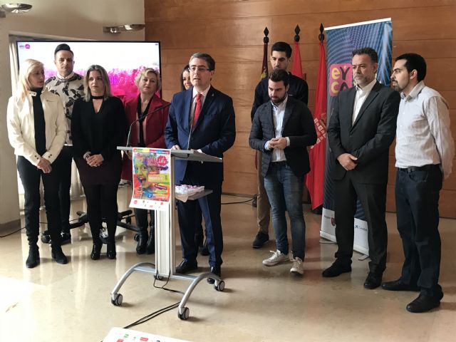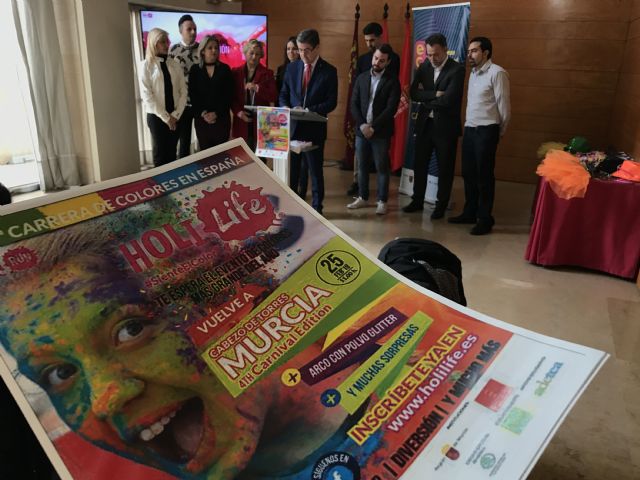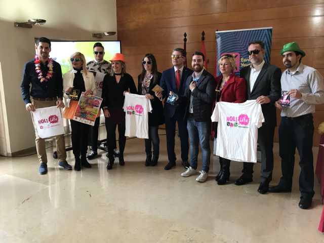 Jesús Pacheco, concejal de Empleo, Turismo y Cultura, con Rebeca Pérez, concejala de Juventud y Cooperación al Desarrollo, y junto con Francisco Javier Sánchez López, Director General de Juventud, miembros de la Junta Municipal de Cabezo de Torres, y  Noemí Latorre, CEO de Holi Life España, han presentado esta mañana la Holi Life 4th Carnival Edition Cabezo de Torres que se celebrará el próximo día 25 de febrero.