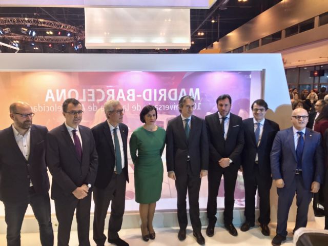 José Ballesta, el ministro Íñigo de la Serna y el presidente de Renfe firman en Fitur el convenio para la promoción turística del municipio a través de los servicios ferroviarios. Los descuentos van dirigidos tanto a viajes familiares y en grupo que tengan origen y destino en la ciudad de Murcia, como a sectores específicos como el turismo de Congresos