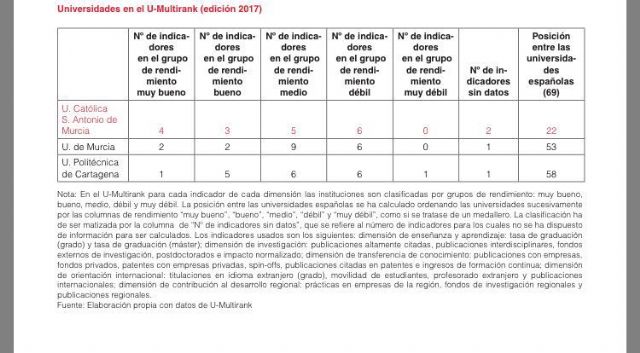 El estudio "Universidades españolas. Una perspectiva autonómica. 2017', evalúa a 69 universidades del país, analiza los datos procedentes del U-Multirank, entre otros, en el que la Universidad Católica de Murcia se sitúa en el puesto 22, la Universidad de Murcia en el 53 y la UPCT en el 58. El estudio se basa en cinco indicadores: enseñanza y aprendizaje, investigación, trasferencia de conocimiento, orientación internacional y contribución al desarrollo regional.