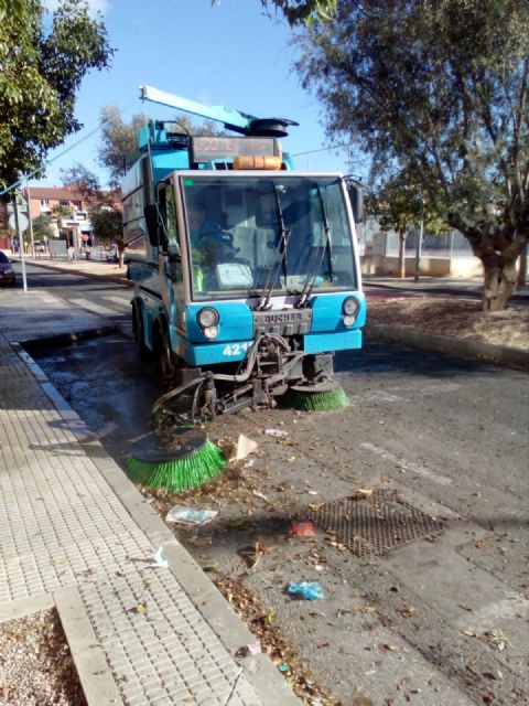 Por su parte, el Servicio de Limpieza Viaria está recolocando contenedores y ha aumentado la limpieza mecánica por el aumento de ramas y hojas en las calles y jardines de numerosas pedanías y de la ciudad. Las actuaciones más relevantes se han llevado a cabo en Huerto Pomares, Plaza Voluntarios, Carlos Valcárcel de La Alberca, Calle Apolonia, Calle Santa Úrsula, Calle Fabián Escribano y Carretera de Mazarrón.