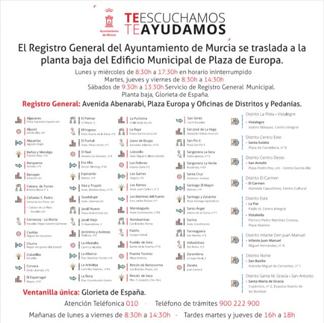 La Concejalía de Modernización de la Administración y Desarrollo Urbano, en colaboración con la federación ThaderConsumo, ha iniciado hoy una campaña para informar a los murcianos de la ubicación y horarios de las 71 oficinas de atención ciudadana bajo el nombre ‘Te escuchamos, te ayudamos’.