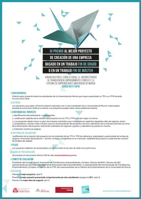 Los mejores trabajos pueden hacerse con premios de 1500 euros al mejor proyecto; 1000 euros al mejor proyecto presentado conjuntamente por dos estudiantes y 500 euros a la mejor idea de negocio. Esta convocatoria se hace por iniciativa del Consejo Social de la Universidad, el Vicerrectorado de Empleo Emprendimiento y Sociedad y la Cátedra de Emprendedores de la Universidad de Murcia. El objetivo es incentivar el talento emprendedor y la creación de empresas entre los universitarios. El plazo de presentación finalizará el 20 de julio de 2018 a las 23:00 horas. Toda la información y las bases la convocatoria pueden consultarse en http://www.um.es/emprendedores/