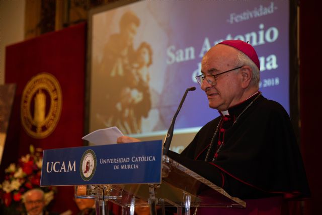 La Universidad Católica de Murcia ha celebrado esta mañana, en el Templo del Monasterio de Los Jerónimos, los actos conmemorativos de la festividad de su patrón, San Antonio de Padua. El presidente de la UCAM, José Luis Mendoza, ha presidido el acto acompañado por la rectora de la Universidad, Josefina García Lozano; el rector honorario de la institución, Antonio Montoro; los arzobispos eméritos de Burgos y Zaragoza, Francisco Gil Hellín y Manuel Ureña; el obispo de la diócesis de Asidonia-Jerez, monseñor José Mazuelos Pérez; José Manuel Lorca Planes, obispo de la Diócesis de Cartagena, y el presidente de la Pontificia Academia para la Vida y del Pontificio Instituto Teológico Juan Pablo II para las Ciencias del Matrimonio y de la Familia, monseñor Vincenzo Paglia, quien ha impartido la lección magistral.
