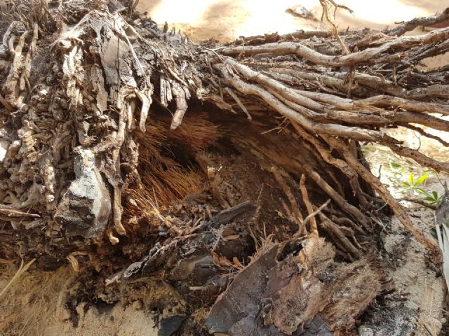 Una de las palmeras, la más grande, parece afectada por picudo rojo, al estar hueca por dentro; y la más pequeña ha aparecido en el suelo por  actos vandálicos