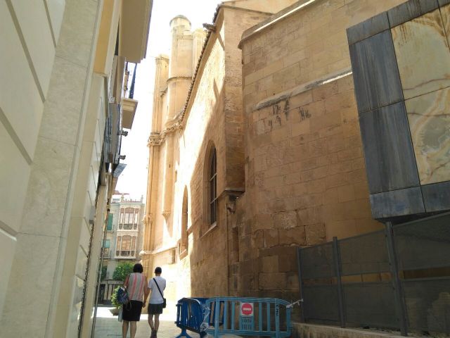 Huermur señala el mal estado de la fachada Este de la Catedral de Murcia en la céntrica calle Oliver, junto a la Capilla de los Vélez, que presenta preocupantes grietas en la sillería y en las cornisas.