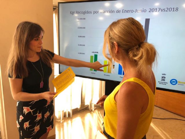 Respecto al vidrio, los murcianos han depositado en los contendores verdes 4.090.740 kilos, 398.560 kilos más que en el primer semestre de 2017, lo que equivale a un crecimiento del 10,79%.