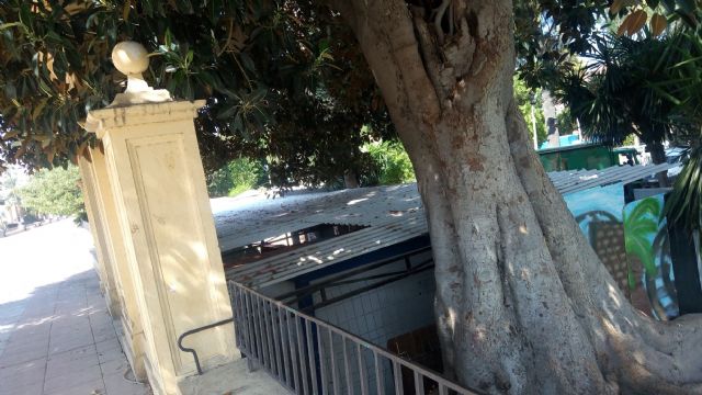 Ahora Murcia ha denunciado que en este mismo lugar, donde el Ayuntamiento indicaba que todavía no se podía recuperar la escalera BIC de este monumento, ahora se ha colocado una caseta de la Fería, junto al centenario muro del paseo que se encontraba sin protección en la zona bajo el pórtico, y sobre las raíces del ficus próximo a este lugar. La caseta-instalación se encuentra a escasos centímetros del ficus, estando colocada bajo la copa del mismo y en su zona de afección.