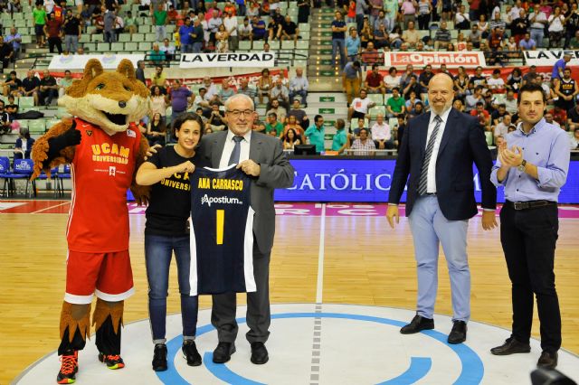 La de ayer fue una noche en la que celebrar muchos éxitos murcianos y de, con la misma fuerza, apoyar a Dejan Todorovic en la recuperación de su lesión. El Palacio de los Deportes, en el descanso, se levantó para aplaudir las gestas de Ana Carrasco, primera mujer en ganar un campeonato mundial, el de SuperSport300; y de Alejandra Sánchez, bronce en el Campeonato de Europa U16. Ambas recibieron de José Luis Mendoza, presidente del UCAM Murcia CB, una camiseta del equipo con su nombre.