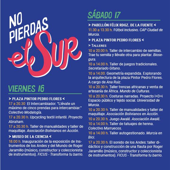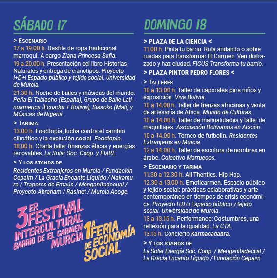 Esta mañana ha arrancado el 3º Festival Intercultural y la 1ª Feria de Economía Social alSur, organizados por el Grupo de Cultura de la Junta Municipal del Carmen, con la participación de más de 30 colectivos y que cuenta con músicas y danzas del mundo, intercambios de ropa y semillas, comercio alternativo, juegos tradicionales y musicales de diferentes países y hasta un campus deportivo inclusivo, organizado por el equipo de fútbol Ciudad de Murcia, con chicos y chicas con diversidad funcional.