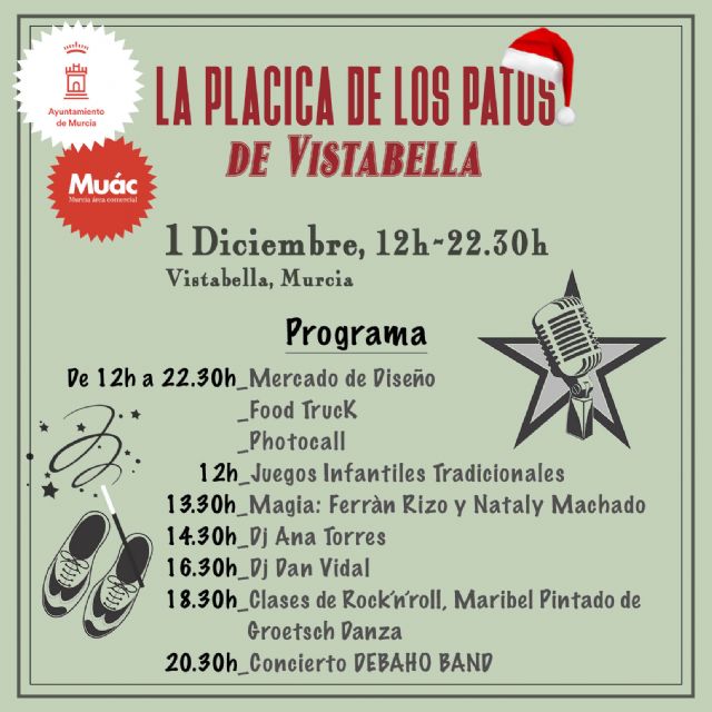 Juegos tradicionales infantiles, espectáculo de magia, clases de rock´n´roll, mercado creativo, food trucks, deejays, concierto y el inconfundible photocall de ‘La Placica de los Patos’ para disfrutar de una nueva jornada en el barrio de Vistabella el sábado 1 de diciembre, a partir de las 12.00 horas y hasta las 22.30 horas de la noche.