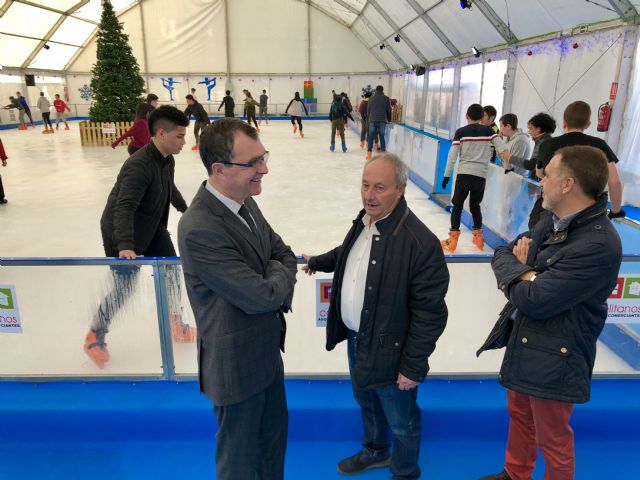 El alcalde de Murcia, José Ballesta, junto a los concejales Maruja Pelegrín y Jesús pacheco, y el presidente de la Asociación de Comerciantes Carmelitanos, Juan Antonio García, inauguraron esta mañana la VI Feria de la Navidad Blanca del Comercio Carmelitano, un espacio para disfrutar en familia ubicado en el Cuartel de Artillería, con pista de hielo, descenso en trineo, carrusel, tren navideño y la Casa de Papá Noel.