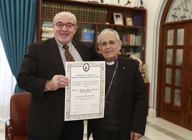 En esta última visita al Campus de Los Jerónimos fue nombrado profesor honorario de Antropología Social de la Universidad Católica de Murcia. El obispo colabora desde hace años con la UCAM, de hecho, el primer libro publicado por la Universidad 'El Pueblo Macua y su Cultura' es obra suya.