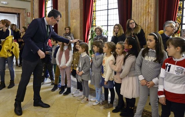 El alcalde de Murcia, José Ballesta, junto a los concejales, Jesús Pacheco y Rafael Gómez, la presidenta de la Asociación de Belenistas de Murcia, María José Esteban, y representantes de la Asociación, hizo hoy entrega de los premios del Concurso Infantil de Belenes a un grupo de escolares de Primaria de los colegios Federico de Arce y San Pablo.