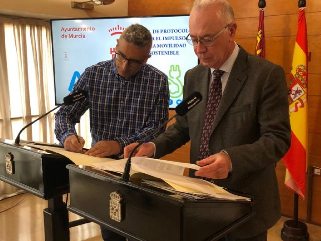 El protocolo de intenciones firmado esta mañana recoge la colaboración para la organización de una feria anual del vehículo eléctrico, así como el impulso a la red de puntos de recarga y la línea de subvenciones públicas para la adquisición automóviles, motos y bicicletas. Navarro: 'Este acuerdo se enmarca en los cuatro ejes fundamentales en los que trabaja el Ayuntamiento para avanzar hacia una Murcia sostenible: el transporte público, la peatonalización, el uso de la bicicleta y la movilidad eléctrica'.