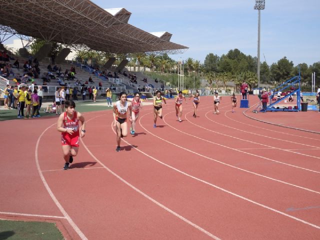 En el apartado femenino, la más veloz en 60m.l. sería la atleta del C.A. Murcia Tovarsport Ana Irene Elewe (7.83), imponiéndose en 300 Eva Ibarra, del UCAM Cartagena (42.95) y en 600 Ana Isabel Navarro, del Atletismo Mazarrón (1:48.28). Lucía Toledo, del UCAM Athleo Cieza, ganó en 1.000 (3:34.38), siendo la mejor en 3.000 Chaimane Amirou, del C.A. Torre Pacheco (13:18.01) en 60m. vallas 0,762 Lucía Morales, del Atletismo Alhama (9.41), quien se impuso igualmente en altura (1.49), longitud (5.10) y triple salto (10.89).