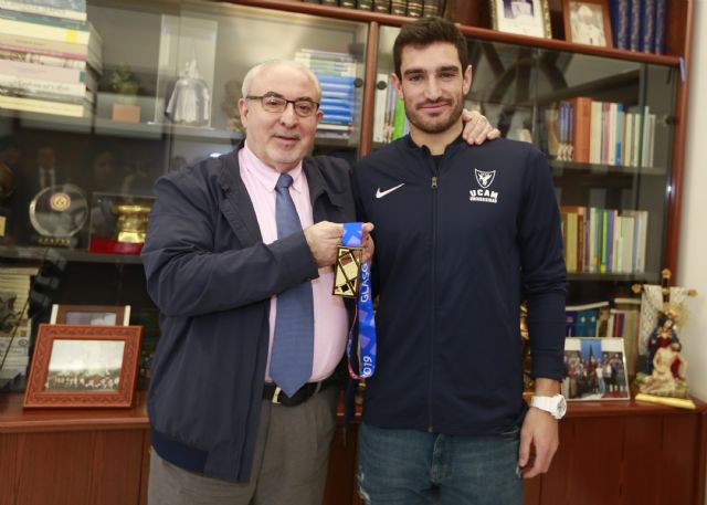Sonriente y todavía aterrizando de la nube de sensaciones a la que se subió en Glasgow tras colgarse el oro europeo de heptalón en pista cubierta, Jorge Ureña llegaba a su universidad, la UCAM, para agradecer a José Luis Mendoza, presidente de la institución docente, su apoyo para compaginar la competición de alto nivel y los estudios que cursa del Grado en Ciencias de la Actividad Física y el Deporte. Un apoyo que ahora se traduce en un gran éxito internacional sin que haya tenido que renunciar a sus aspiraciones académicas: "Gracias a la Universidad Católica tengo un margen para no dejar los entrenamientos. La vida en activo de un deportista es corta pero gracias a la UCAM voy poco a poco estudiando y cuando termine tendré un título universitario para afrontar el siguiente paso".