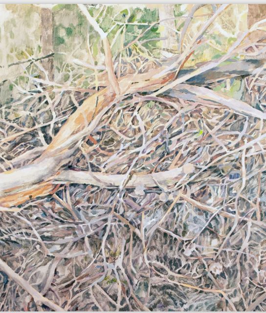 En las demás obras se centra en los detalles, dando protagonismo a los ramajes, los espinos y la rugosidad de los troncos de los árboles, que se complementan con las grandes obras. Y es que, Chezner es defensora de la mirada sensitiva y emocional del paisaje y maneja con destreza el color y los pigmentos para unir la obra de arte con la naturaleza. El color, que es tierra, hoja o resina nace en la naturaleza y llega al arte.