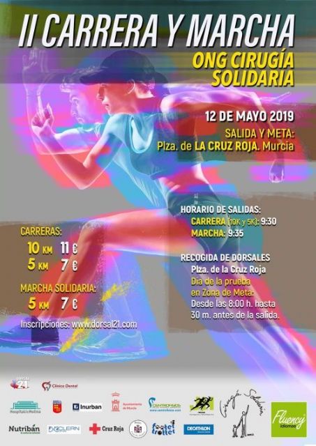 El calendario popular nos ofrecerá en unos días otra importante cita con la solidaridad como eje. Así será el domingo 12 de mayo, con motivo de la II Carrera y Marcha "ONG Cirugía Solidaria", organizada por dicha entidad con la colaboración entre otros de la Federación de Atletismo de la Región de Murcia, que contará como lugar de salida y meta en la Plaza de la Cruz Roja. A las 9:30h. dará comienzo la prueba absoluta, dando la opción de elegir entre aproximadamente 5 o 10km., iniciándose a las 9:35h. la marcha solidaria no competitiva de 5km.