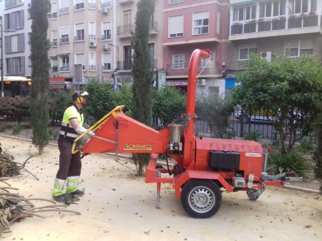 Trituran los restos de poda del jardín de Floridablanca para incorporarlos al suelo respetando el 'ciclo verde' de la naturaleza