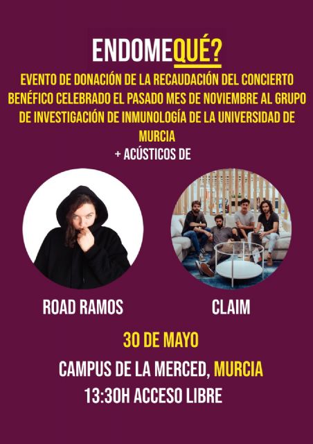 El grupo de Inmunología de Endometriosis de la Universidad de Murcia recibe este jueves, 30 de mayo, el cheque de 6.000 euros que la Asociación 'EndomeQué?' recaudó el pasado mes de noviembre en un concierto benéfico celebrado en Madrid. El acto de entrega de este dinero tendrá lugar en el campus de la Merced a las 13.30 horas e incluirá la actuación en acústico de Road Ramos y Claim. El acto contará con los miembros de investigación de Inmunología de Endometriosis y con el rector de la UMU, José Luján.