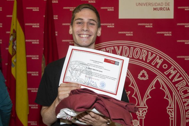 David Vigueras Lucas ha recibido este viernes el premio al 'Voluntario del mes' del proyecto 17 ODSesiones de la Universidad de Murcia. El rector de la UMU, José Luján, ha sido el encargado de hacerle entrega de este reconocimiento por su colaboración e implicación personal en las actividades que se han organizado para la promoción de los Objetivos de Desarrollo Sostenible. El joven, que pertenece a la asociación Astrade y es autista, ha destacado especialmente por su alegría y don de gentes, así como por el interés personal que ha demostrado en el proyecto 17 ODSesiones.