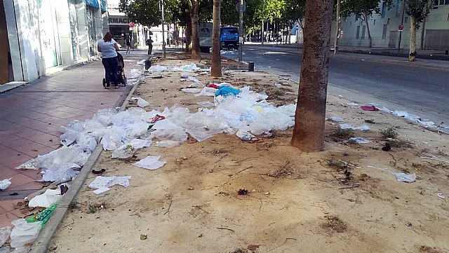 La Asociación de Vecinos Vistabella exige al Ayuntamiento de Murcia que se apliquen soluciones a la situación de suciedad en la que se encuentra el barrio cada jueves, tras el mercado ambulante que se coloca semanalmente en sus inmediaciones. A pesar de que una cuadrilla de limpieza interviene durante varias horas para limpiar las calles, es habitual, incluso al día siguiente, la presencia de gran cantidad de papeles y plásticos en las calles de Vistabella, dando una imagen deplorable de suciedad que deben sufrir los vecinos del barrio, además de la insalubridad que supone.