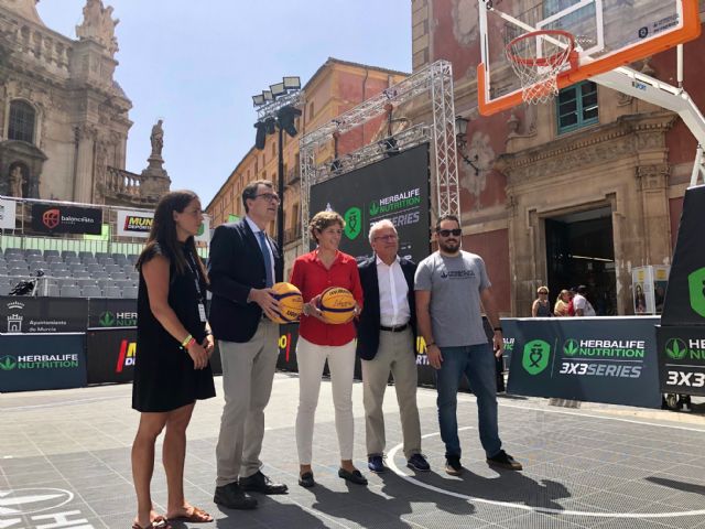 El alcalde de Murcia, José Ballesta, junto al concejal de Deportes y Salud, Felipe Coello, la directora de Madison Sport Marketing, Isabel Mateos, la directora de Competiciones de la Federación Española de Baloncesto, Elisa Aguilar, el responsable de Comunicación de Herbalife Nutrition España, Carlos Mañoso, y el presidente de la Federación Murciana Baloncesto, Juan Carlos Hernández, presentaron hoy el evento deportivo Herbalife 3x3 Series Murcia Open, el mayor espectáculo de baloncesto 3x3 de España, que acoge la Plaza Belluga esta tarde y mañana sábado.