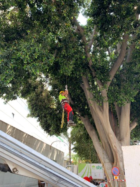 Técnicos del Ayuntamiento de Murcia y de la empresa concesionaria STV Gestión han realizado trabajos de revisión e hidratación de los ficus de Floridablanca debido a las altas temperaturas de estas semanas.